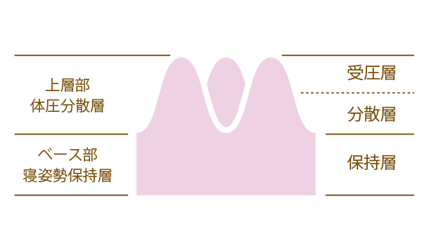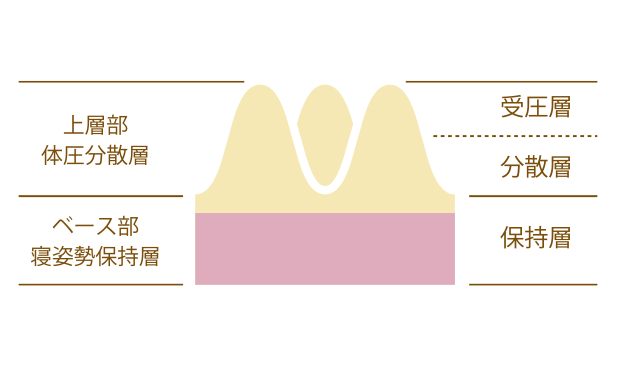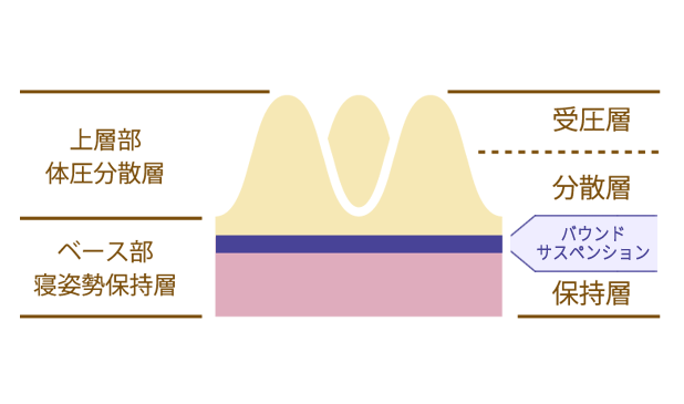 2層構造の上層部 体圧分散層、ベース部 寝姿勢保持層の間にバウンドサスペンションを加えることにより、クッション性を高めます。